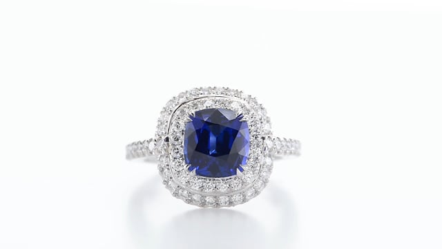 A magnificent Couture Double Halo Blue Royal Sapphire ring mounted in Platinum. There are 64 Brilliant cut diamonds set in a closed and open Pave design around the Sapphire and along the shank. The Cushion shape Royal Sapphire weighs 2.81cts and is certified by GRS. For more information about this item please contact our customer service department.