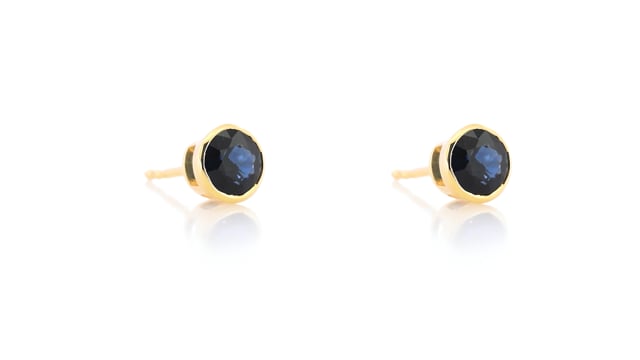 A delightful pair of blue round brilliant stud sapphire earrings, with a pair of gemstones weighing 1.40cts total weight. The sapphires are bezel set and mounted in 18K yellow gold. For more information about this item please contact our customer service department.