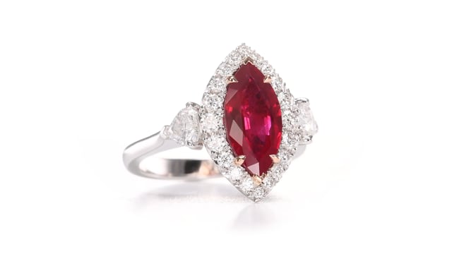 Burmese Marquise Ruby and Heart Diamond Three-Stone Halo Ring (2.89Ct TW)