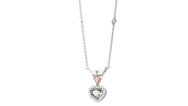 A fabulous Chameleon heart and kite halo drop pendant, with a center diamond weighing 1.23cts and certified by GIA. The diamond is styled with collection color brilliants set in an open pave halo, and the pendant is mounted in 18K white and rose gold. Accenting the halo drop is a fancy brownish orangy pink kite shape diamond, which is crowned by 2 D color kite diamonds set in a wing motif. For more information about this item please contact our customer service department.