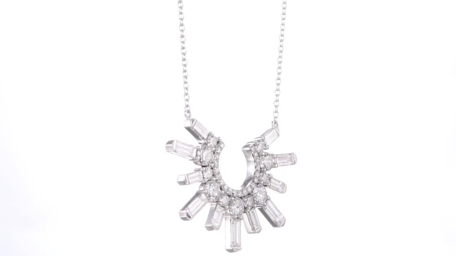 An extraordinary white diamond pendant, featuring collection color brilliants and baguettes styled in an abstract design and mounted in 18K white gold. The bangle has optional matching earrings and bangle. For more information about this item please contact our customer service department.