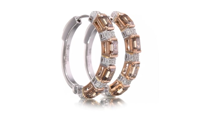 A fabulous pair of fancy brown diamond hoop earrings with 4.62cts emerald shape diamonds styled in a semi bezel setting and accented by collection color brilliants side stones. The earrings are mounted in 18K white and rose gold. For more information about this item please contact our customer service department.