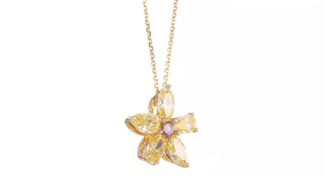 A beautiful multicolored floral style drop diamond pendant, featuring fancy yellow mix shape diamonds, total weight 1.19cts. The flower is accented with a fancy intense orangy pink brilliant center diamond, and the pendant is mounted in 18K yellow and rose gold. For more information about this item please contact our customer service department.