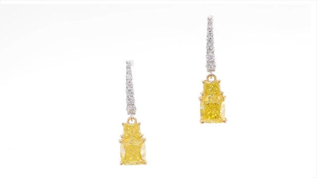 An elegant pair of Fancy Intense Yellow Cushion and Vivid Yellow Taper Diamond Drop Earrings, total weight 2.56cts. The diamonds are set with the tapers above the Cushion, one above the other, and styled in a Claw setting. The post is accented with 14 F+ color brilliants styled in a prong setting, and the earrings are mounted in 18K White and Yellow Gold. For more information about this item please contact our customer service department.