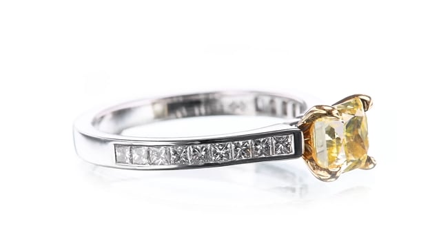 Of super color and outstanding effect..... a beautiful fancy intense yellow radiant and princess diamond side stone ring, with a center stone weighing 1.03cts and certified by GIA. The shank is accented with collection color princess diamonds side stones styled in a closed pave, and the ring is mounted in 18K white and yellow gold. For more information about this item please contact our customer service department.