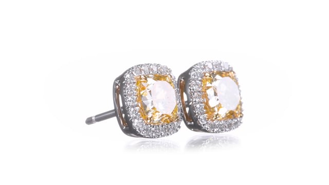 A beautiful pair of fancy light yellow cushion diamond halo earrings, with a pair of diamonds weighing 2.54cts and certified by GIA. Mounted in 18K white and yellow gold, these exquisite earrings feature collection color brilliants styled in an open pave halo. For more information about this item please contact our customer service department.
