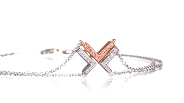 A beautiful fancy pink and white diamond Leibish logo bracelet, featuring a closed pave leibish logo, and mounted in 18K white and rose gold. The appearance of the final product may vary slightly from the images shown. For more information about this item please contact our customer service department.