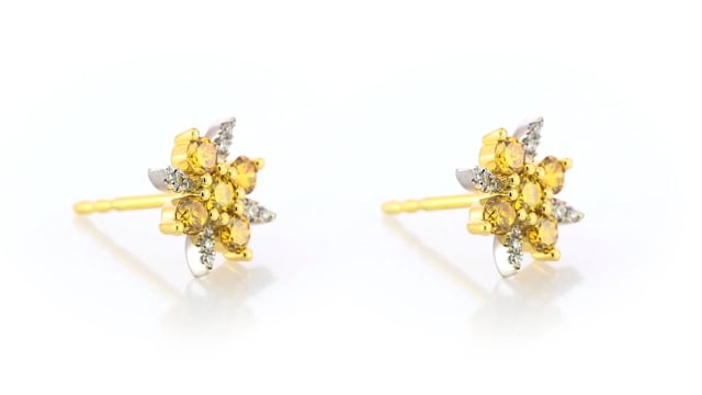 A stylish pair of fancy vivid orange yellow and white diamond pave earrings, featuring a floral motif and mounted in 18K white and yellow gold. Color and clarity are graded by our in-house GIA GG Graduate Gemologist. For more information about this item please contact our customer service department.