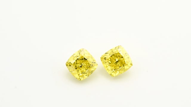 A wonderful pair of fancy vivid yellow, cushion diamonds, total weight 0.90cts, with VS1 clarity, certified by GIA. The stones face-up beautifully and can be purchased as a loose pair or set as a pair of earrings in a Leibish setting style or custom design. For more information about this item please contact our customer service department.
