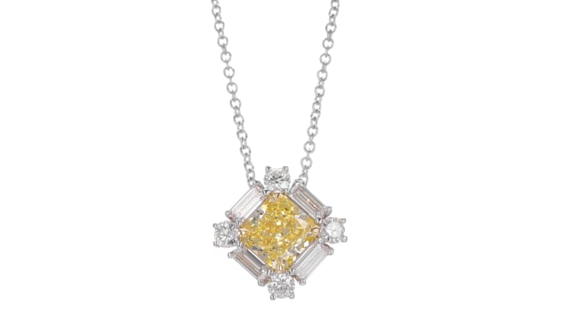 A beautiful fancy yellow diamond pendant, with a center radiant diamond weighing 1.35cts. and certified by GIA. The diamond is accented by collection color brilliants and baguettes styled in a shared prong halo, and is mounted in 18K white and yellow gold. For more information about this item please contact our customer service department.