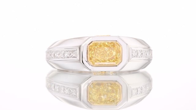 A stunning Fancy Yellow Radiant diamond men's ring, with a center diamond weighing 1.11ct and certified by GIA. The diamond is accented by collection color Princess cut diamonds styled along the shank in a Chanel setting, and the ring is mounted in Platinum and 18k yellow gold. For more information about this item please contact our customer service department.
