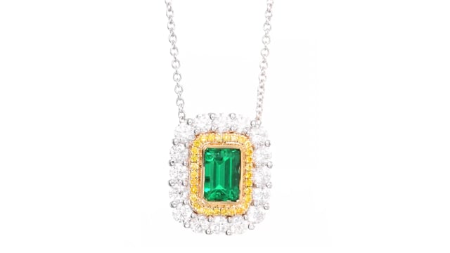 A gorgeous green emerald and diamond double halo pendant, with a center emerald shape gemstone weighing 1.00cts and certified by AGL. The pendant features a two color double halo styled in an open pave and mounted in 18K white and yellow gold. The pendant is part of the Rosie's Bloom collection. For more information about this item please contact our customer service department.