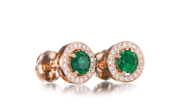 A wonderful pair of round green emerald halo diamond earrings, with a pair of gemstones weighing 0.92cts. The earrings feature collection color brilliants styled in a closed pave halo with a milgrain edge, and are mounted in 18K rose gold. For more information about this item please contact our customer service department.