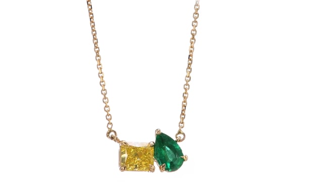 A lovely 2 stone emerald and fancy vivid yellow diamond pendant, with a pear shape emerald gemstone weighing 0.28cts and a fancy vivid yellow radiant shape diamond weighing 0.51cts. and certified by GIA. The stones are styled in prongs and mounted in 18K yellow gold. For more information about this item please contact our customer service department.