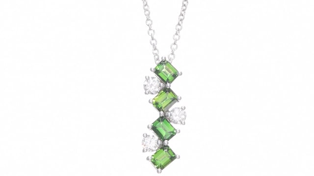 A stylish green tourmaline and diamond drop pendant, with emerald shape tourmalines and white diamond brilliants styled in an alternating zigzag motif, and mounted in 18K white gold. The pendant has the option to be purchased as part of a matching set of earrings and ring. The appearance of the final product may vary slightly from the images shown. For more information about this item please contact our customer service department.