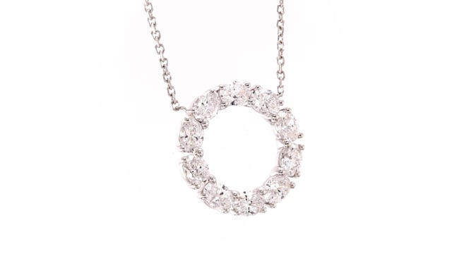 A beautiful hoop motif diamond pendant featuring 1.41cts F-G color ovals styled in shared prongs and mounted in 18K white gold. Color and clarity are graded by our in-house GIA GG Graduate Gemologist. For more information about this item please contact our customer service department.