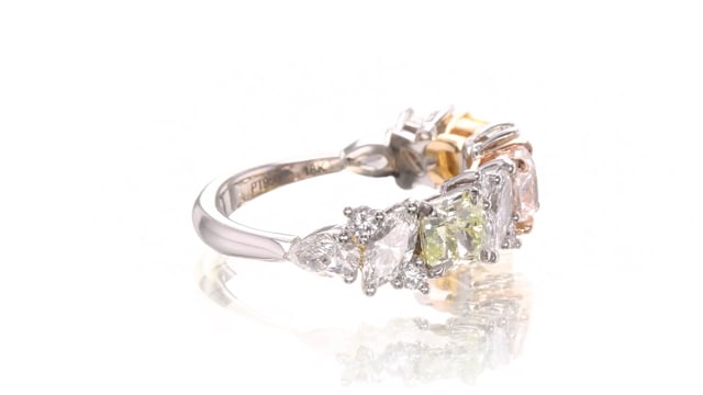 Inspired by nature, this beautiful ring features yellow, green and brown radiant and cushion shape diamonds, styled in an asymmetrical design and certified by GIA. These diamonds are accented by collection color pears marquise and brilliants, all styled in prongs, and the ring is mounted in platinum and 18K yellow and rose gold. For more information about this item please contact our customer service department.