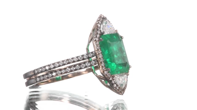 A stunning ring featuring a Muzo emerald as its centerpiece, weighing 2.64 carats and certified by both Muzo and CD. This exquisite piece is adorned with collection color epaulette side stones and elegantly framed by an open pave halo and a double shank. Crafted in 18K white gold with a stylish black rhodium finish, it's a true gem lover's delight. For more information about this item please contact our customer service department.