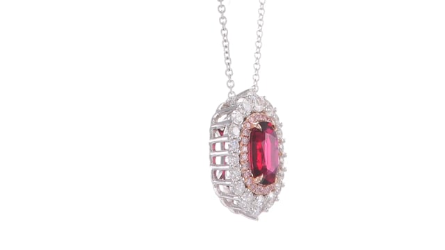 A beautiful Pigeon Blood red oval ruby and diamond double halo pendant, with a center gemstone weighing 2.29cts and certified by GRS. The pendant features a two color double halo styled in an open pave and mounted in 18K white and rose gold. The pendant is part of the Rosie's Bloom collection. For more information about this item please contact our customer service department.