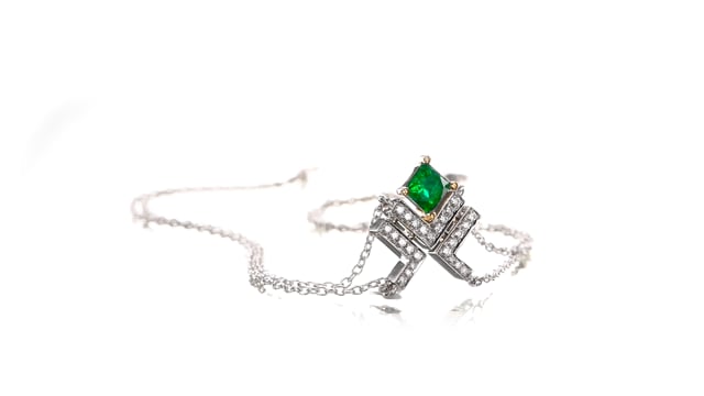 Stylish bracelet, with a princess emerald and collection color brilliants styled in a channel set, closed pave Leibish logo design and mounted in 18K white. For more information about this item please contact our customer service department.