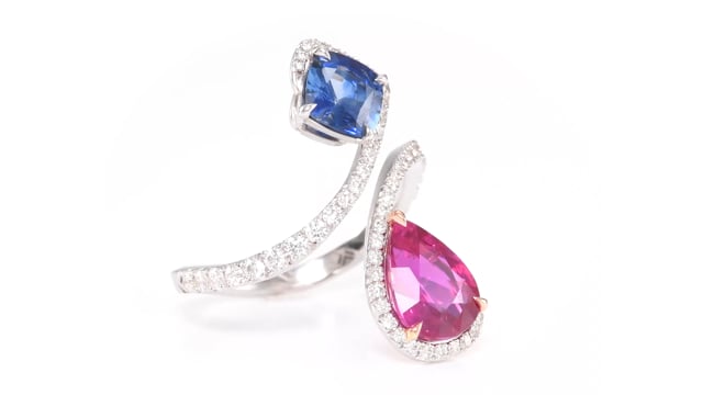 A fabulous two-stone ring, featuring a ruby and blue sapphire with colorless round brilliant diamonds on the shank and a half halo. The ruby is certified by TGL. Mounted in 18K white and rose gold. For more information about this item please contact our customer service department.
