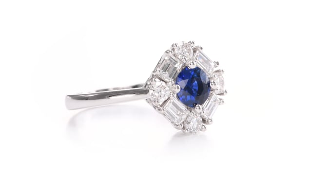 A beautiful round blue sapphire halo ring, with a center stone weighing 0,62cts. The ring features collection color brilliants and baguettes, styled in a contemporary shared prong halo, and the ring is mounted in 18K white gold. Falls Sie nähere Informationen zu diesem Stein möchten, wenden Sie sich bitte an unseren Kundendienst.