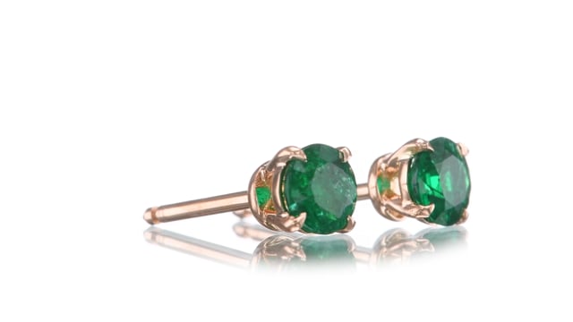 A lovely pair of round green emerald stud earrings, with a pair of emeralds weighing 0.87cts total weight. The earrings are styled in a 4 prong setting and mounted in 18K y rose gold. For more information about this item please contact our customer service department.