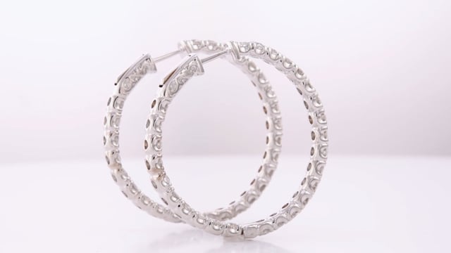 Collection color round white diamond hoop earrings with 5.50cts+ diamonds styled in a prong setting and mounted in 14K white gold. Color and clarity graded by our in house GIA GG Graduate Gemologist. Color and clarity are graded by our in-house GIA GG Graduate Gemologist. For more information about this item please contact our customer service department.